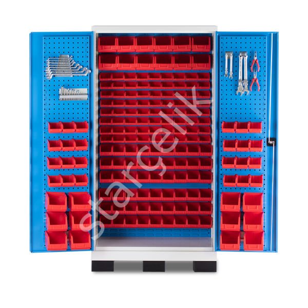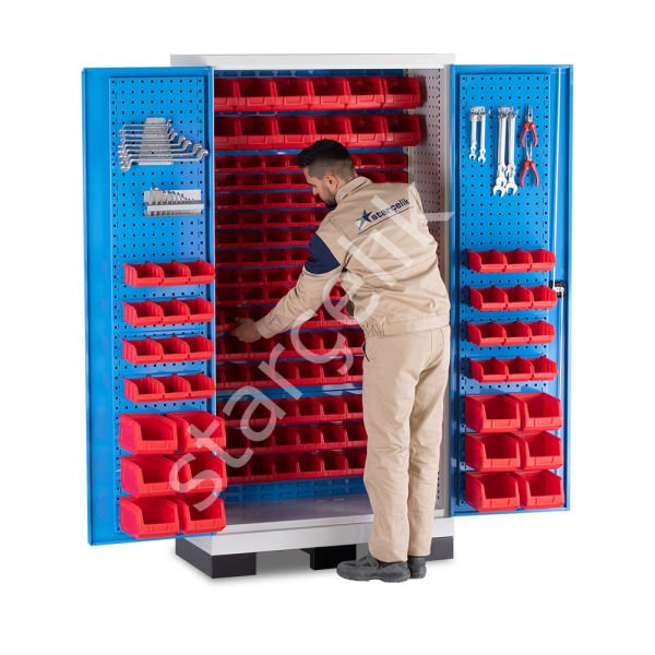 Endüstriyel iş dolabı serisinden bu ağır tip metal dolabımız, aletlerinizin alet asma panoları ve kancaları asılma yöntemi ile düzenlenmesi ve adresleme yapılarak depolanması için tasarlanmıştır. Ayrıca küçük avadanlık kutuları ile de dökme malzeme saklama imkânı sunan, endüstriyel iş dolabımız 24 çeşit alet asma kancası ve farklı aksesuarlar ile desteklenmektedir.